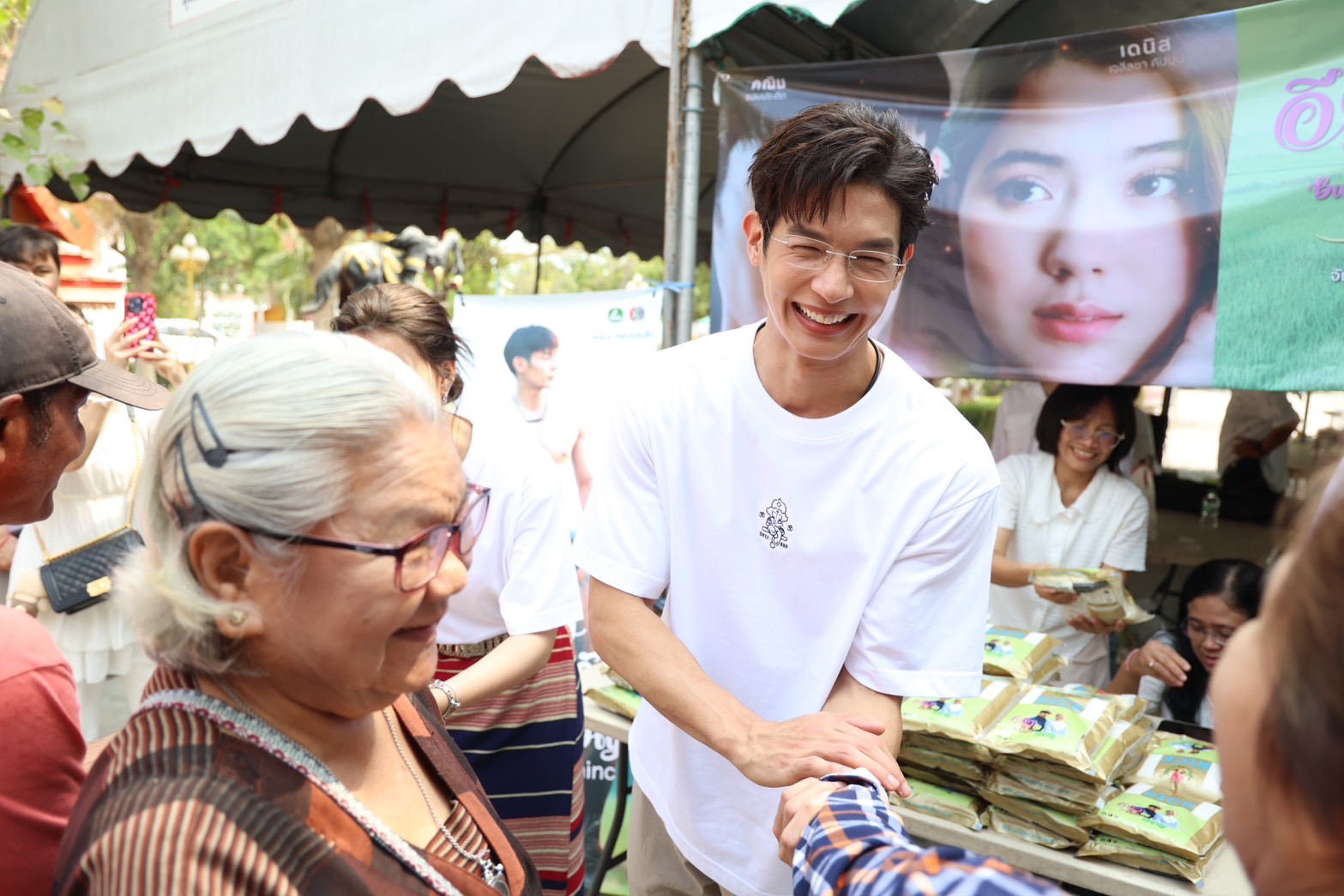 ไม่ว่าจะเป็น ผัดหมี่โคราช, ส้มตำ ฯลฯ และงานนี้หนุ่มเพื่อน คณิน พระเอกสุดแซ่บได้นำข้าวสารตราบัวชมพูมาแจกให้กับผู้คนบริเวณวัดอีกด้วย